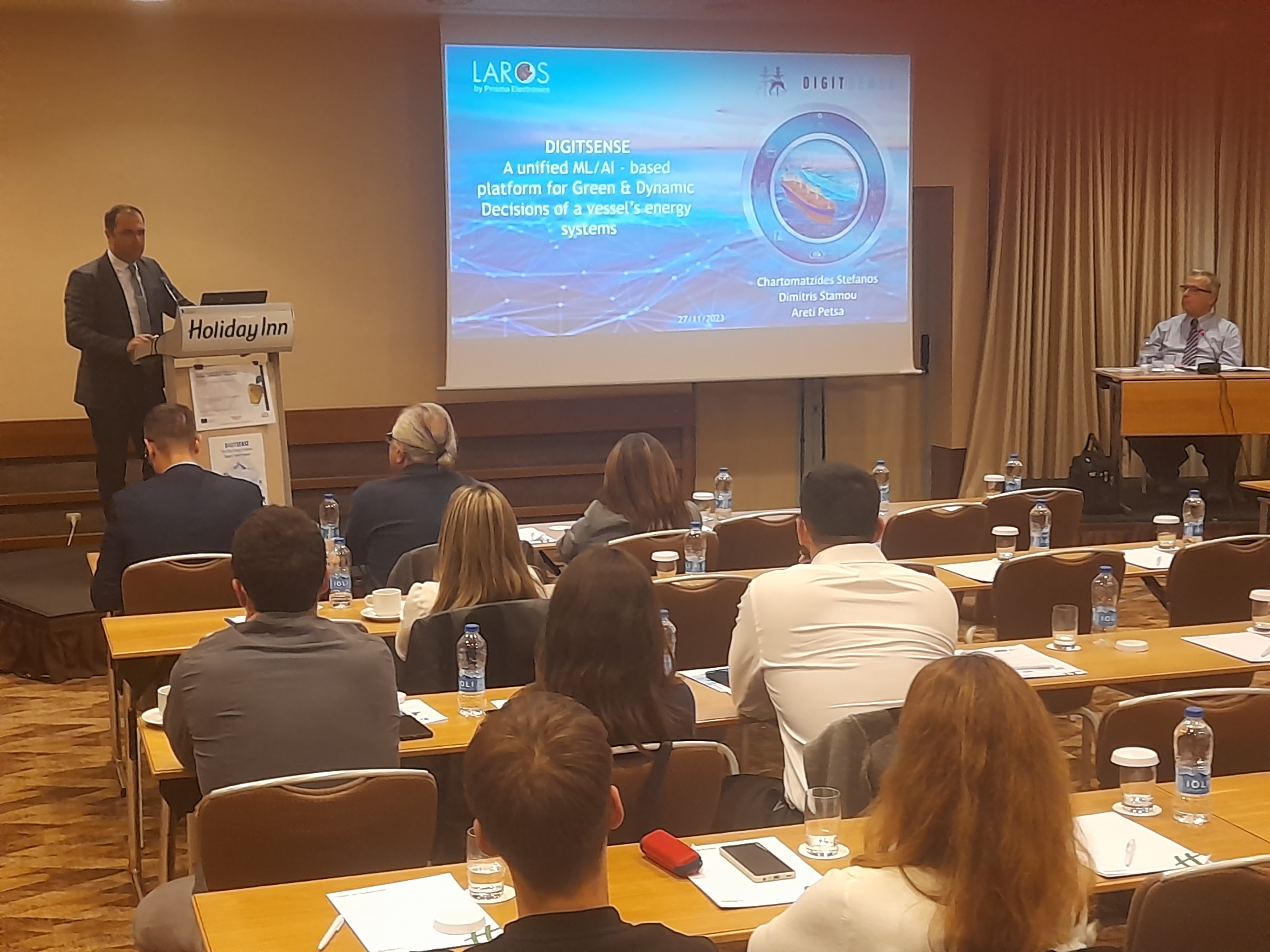 In the context of the DIGITSENSE Research program, a workshop took place on Monday 27.11.2023 in Athens with great success,. The object of DIGITSENSE is the development of an innovative intelligent digital-twin of ships' energy systems which constitutes an integrated platform for the collection, processing and visualization of the measurements from the various sensors installed on the ship, while at the same time these measurements feed simulation models (graded levels of physical depth) of the ship's energy systems. PRISMA ELECTRONICS SA collaborated with the Shipbuilding and Marine Engineering Department of the Naval Cadet School, the Energy and Environmental Research Laboratory - ELKE-EKPA/ E²ReLab and Laskaridis Shipping Co., Ltd for the development of the "Digital Twin" of the energy systems of a ship.